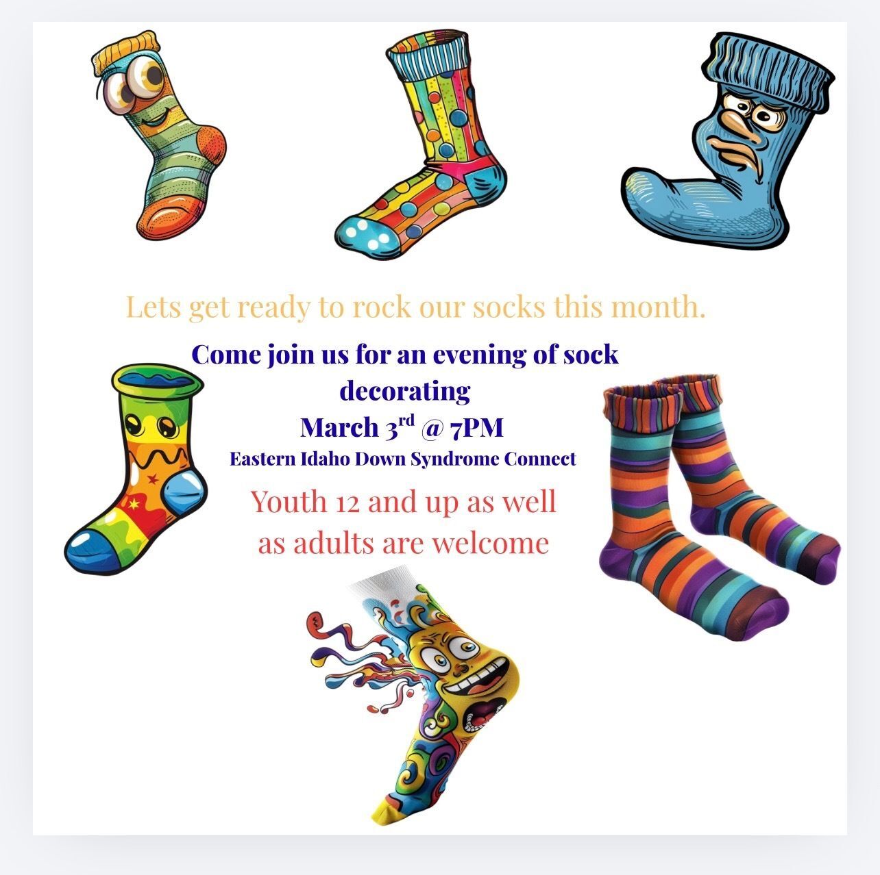 Come join us at the EIDS office to make socks to get ready for World Down Syndrome Day! It will be from 7-8 pm. This is for individuals with Down syndrome 12 years and older. This is also our Shining Stars (adults) event for the month. Please register so wecan get everything ready!